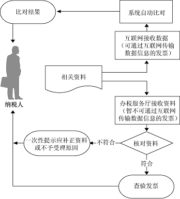 。1)辦稅服務(wù)廳接收資料,核對資料是否齊全、是否符合法定形式,符合的即時辦結(jié);不符合的當場一次性提示應(yīng)補正資料或不予受理原因。