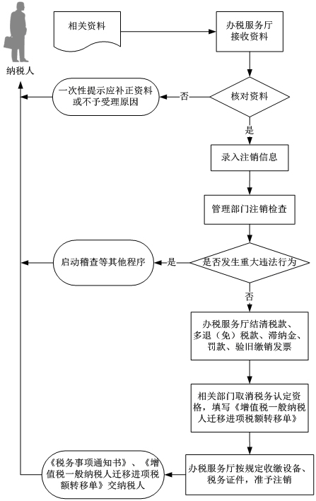。3)辦稅服務(wù)廳結(jié)清應(yīng)納稅款、多退(免)的稅款以及滯納金、罰款,繳銷稅務(wù)登記證及副本,《發(fā)票領(lǐng)用簿》和其他稅務(wù)證件,制作《稅務(wù)事項(xiàng)通知書》交納稅人。