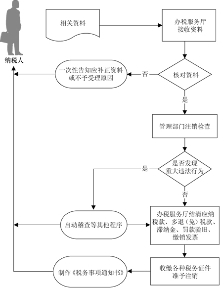 。5)收繳稅務(wù)登記證及副本、《發(fā)票領(lǐng)用簿》和其他稅務(wù)證件,核準(zhǔn)注銷稅務(wù)登記,制作《稅務(wù)事項(xiàng)通知書》交納稅人。